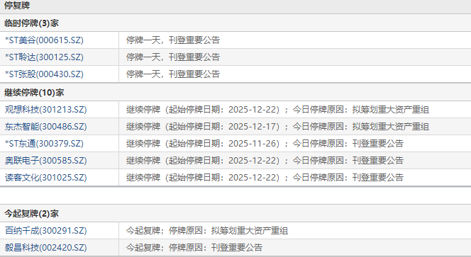 上证报中国证券网讯 12月26日,3家公司临停:*ST美谷、*ST聆达(维权)、*ST张股银泰证券,2家公司复牌:百纳千成、毅昌科技。